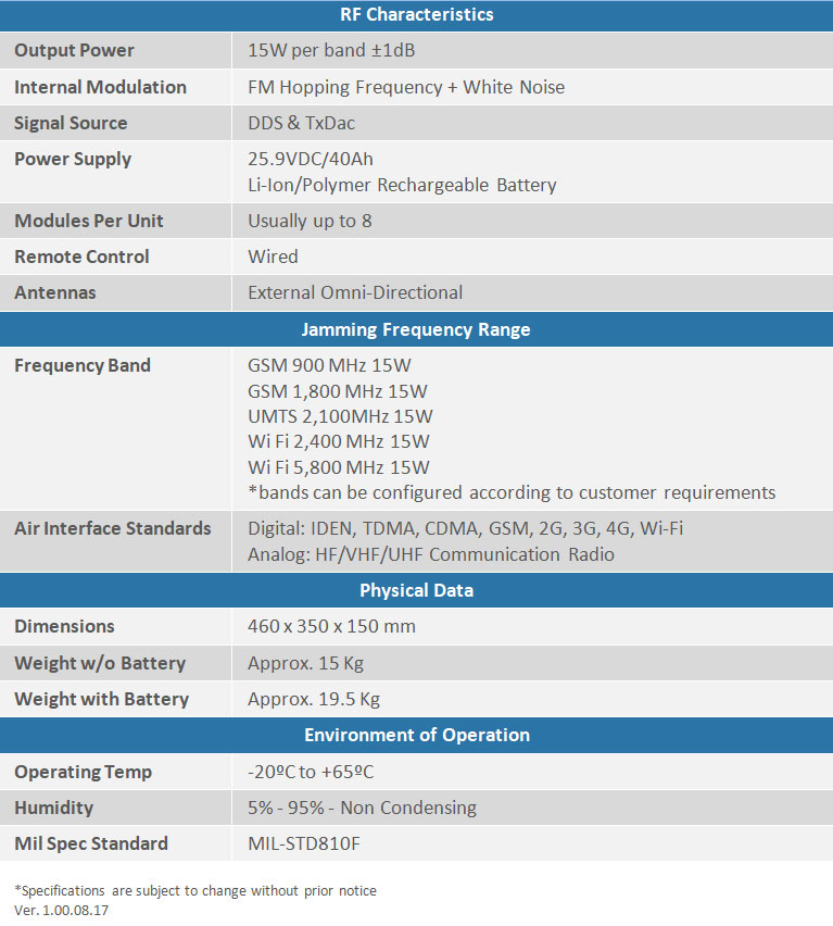 The Man Pack model PR808 Tactical Jammer has been designed to neutralize RF and Cellular communication during special units’ activity in the field.